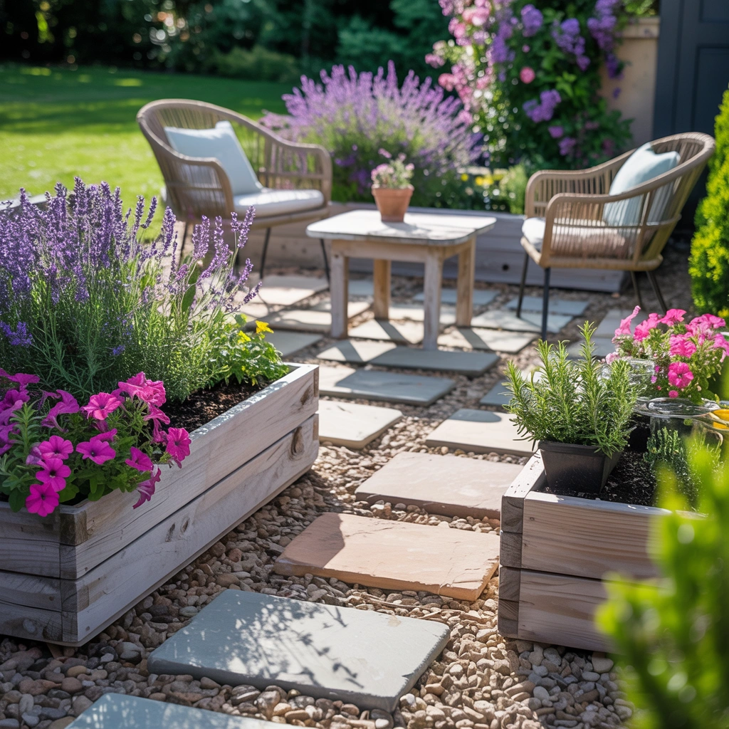 Combining a patio with raised garden planters can make your outdoor space both functional and beautiful. Lay pavers in a simple layout and fill the gaps with gravel for texture and drainage. Then place raised planter boxes around the edges of the patio.