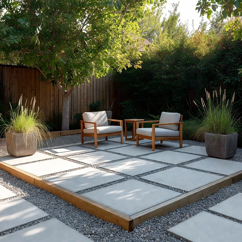 A concrete paver patio offers a clean and modern look while staying budget friendly. Start by preparing a compact gravel base, then place large pavers evenly across the space. The gaps between pavers can be filled with gravel or sand to create a structured pattern.