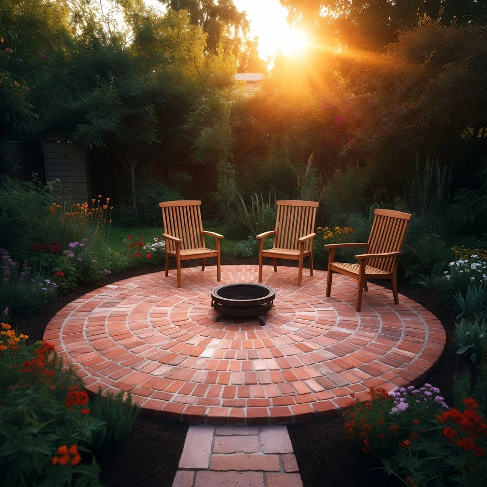 A circular brick patio creates a charming focal point in any backyard. Start by marking a circular area and laying bricks in a radial pattern. This layout gives the patio a traditional and timeless appearance while remaining affordable compared to poured concrete.
