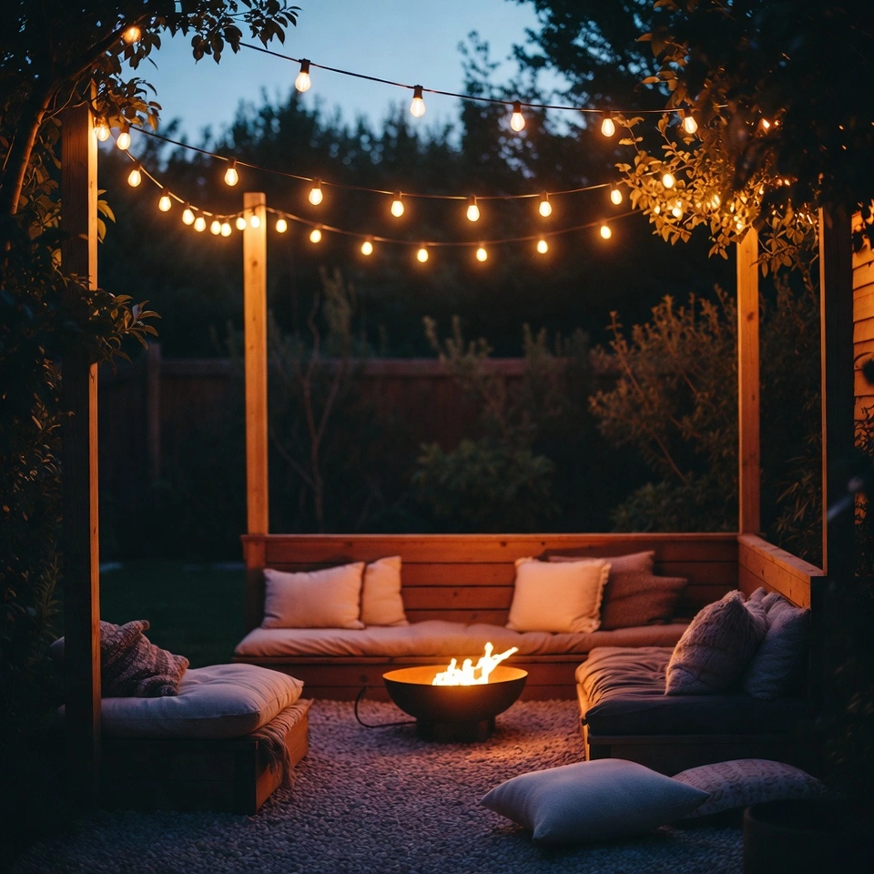 Combine the lighting with a gravel or paver patio base and comfortable seating. At night, the soft lights create a relaxing and welcoming atmosphere. This DIY patio idea is perfect for evening gatherings and outdoor dinners with friends and family.