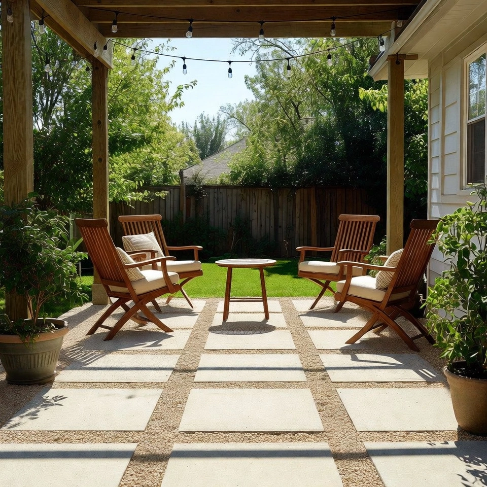 Place large stepping pavers on top of the gravel to stabilize furniture and add visual structure. The contrast between smooth pavers and textured gravel creates a stylish look that works well in both modern and rustic backyard designs. It is a practical and low-cost way to upgrade your patio.