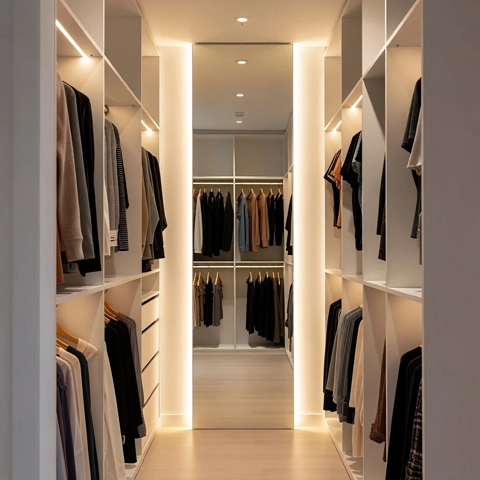 Warm white lighting maintains a natural look when choosing outfits. Combining ceiling lighting with shelf or rod lights ensures every corner of the closet is well-lit, eliminating dark areas that make narrow spaces feel smaller.
